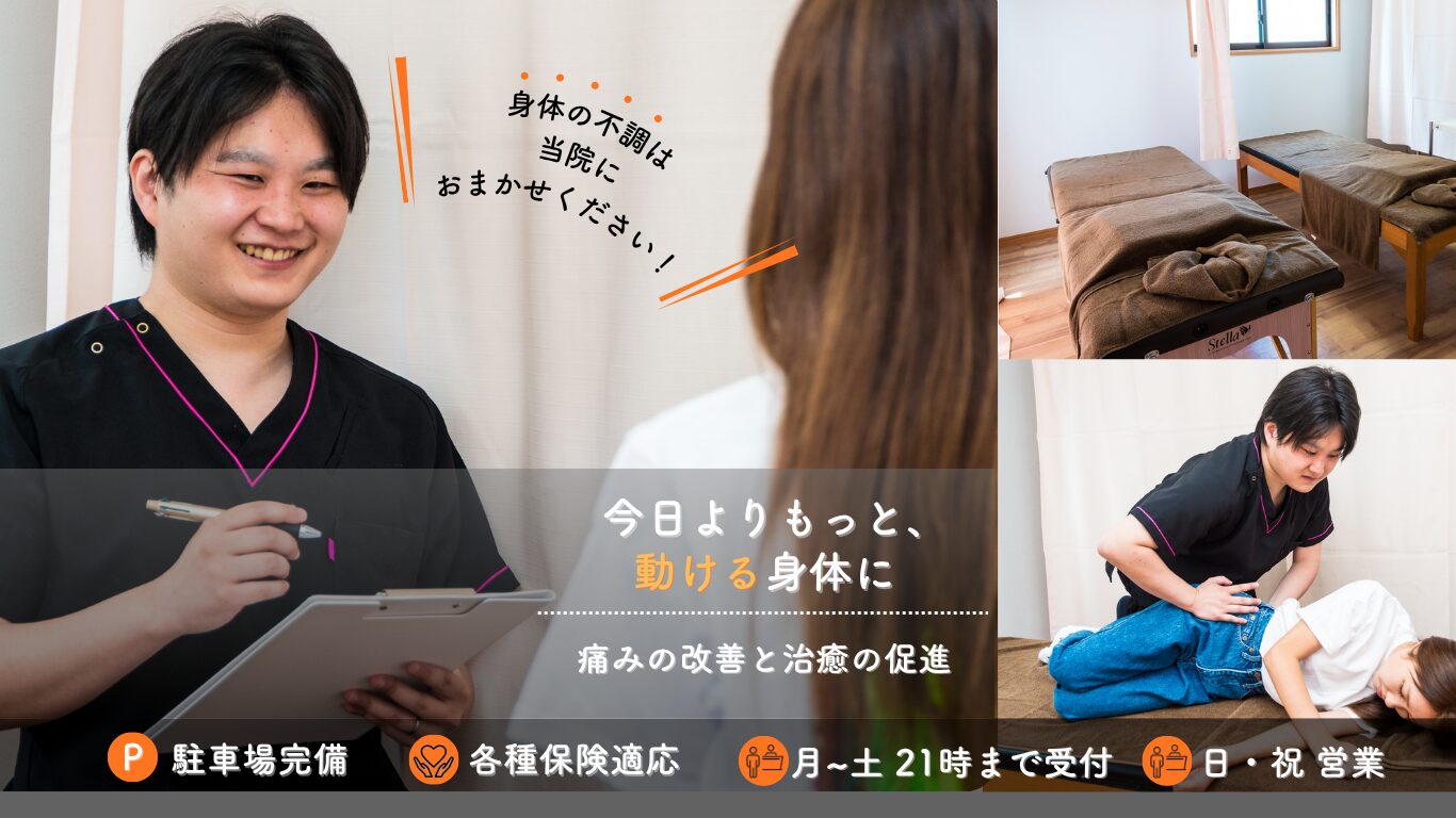 ご予約優先制で、平日・土曜は夜21時まで、日曜・祝日も受け付けしておりますので、気になっている不調がありましたら、お気軽にご相談ください。