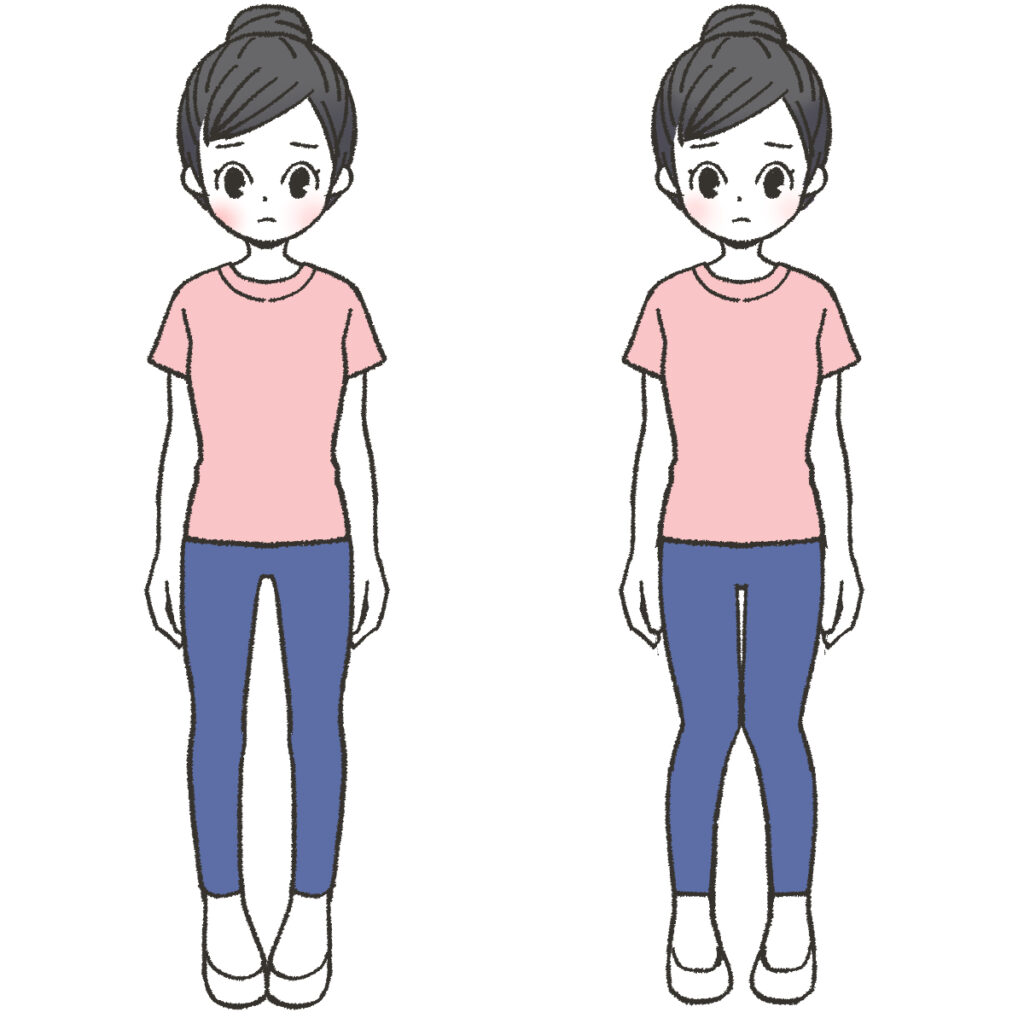 片足にばかり体重をかける立ち方、脚を組む習慣、外股・内股での歩行などは、左右の筋肉や関節にかかる負担を偏らせてしまいます。その結果、骨盤や膝の軸が少しずつズレ、X脚・O脚の形成につながります。